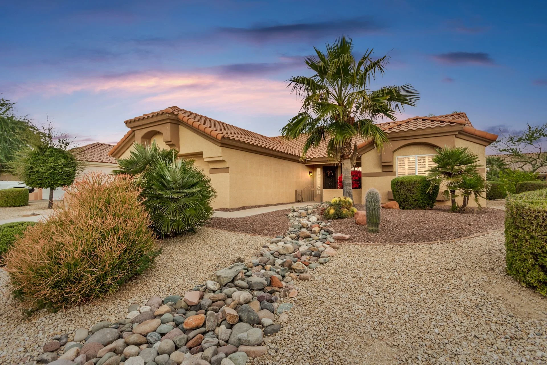 Beautifully expanded Payson w/ split floor plan & light/bright living areas. The spacious great room features plantation shutters, large windows, & tall ceilings. The kitchen includes granite countertops, gas stove, breakfast bar w/ pendant lighting, eat-in kitchen area, & 2 door pantry. Added family room off the kitchen w/ gas fireplace, multiple sliders, & decor shelves. Your master suite boasts a bay window, his/hers closets, dual sinks w/ vanity area, large walk-in shower, & separate toilet room. Don't forget the additional bedroom w/ full bathroom. Indoor laundry w/ utility sink & storage closet. Garage comes equipped w/ workbench area, storage cabinets, & service door. New HVAC 2019. Both the front & back yards are meticulously maintained & offer covered patios w/ stucco knee walls. HOA fee includes landscaping maintenance w/ watering, trash pickup, pest control, & cable TV. Furniture available on a separate bill of sale.