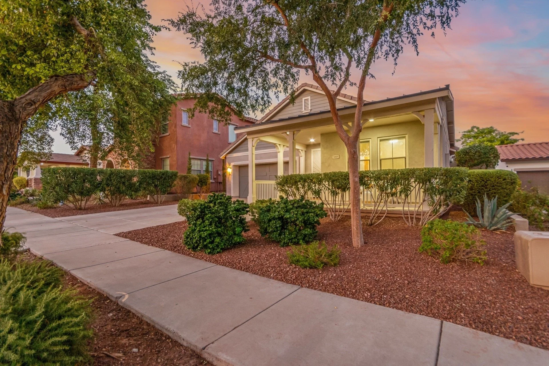 Beautiful 3 bed, 2 bath single level home in the heart of the master planned community of Verrado’s Heritage District! Conveniently located in close proximity to multiple parks, “A” rated schools, trails, & the Heritage Swim Park. Upon arrival, you are welcomed by a charming, recently painted exterior (2021), cozy front porch perfect for relaxation or gatherings, & well-manicured landscaping. Inside, you’ll find a split floor plan with 3 nice-sized bedrooms & 2 full bathrooms. Your master suite offers plenty of room to rest & unwind with a separate tub and shower, dual sinks, huge walk-in closet, & linen closet. The well-thought-out kitchen opens up to the living area & showcases a large island with breakfast bar, granite countertops, ample counter/cabinet space, under cabinet lighting, stainless steel appliances, gas stove, backsplash, & a walk-in pantry. The open-concept living area is perfect for entertaining with a spacious great room, dining area, & glass slider overlooking the backyard oasis. This incredible space allows for indoor/outdoor living with a covered back patio extended with pavers, fan, a large pergola for additional shade & privacy with electrical outlets & lights, mature, low maintenance landscaping on an automatic H20 system, & fresh rock. Indoor laundry room with cabinets & 2 car garage with nice-sized driveway for additional parking. Recently painted neutral interior, BRAND NEW carpet, sunscreens, fans & window coverings throughout, gutters, & regularly serviced NEW AC unit (2022). Verrado amenities include 78+ community parks, 2 community pools, 26+ miles of walking/biking/ hiking trails, fitness center, 2 public golf courses, & walkable Main Street featuring dining & shopping. Costco, Fry’s, multiple other shops & restaurants, & Skyline Regional Park are only minutes away. Come live the Verrado lifestyle & enjoy all that this wonderful community has to offer!